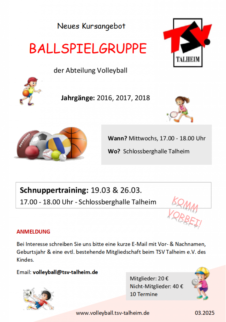 Die Ballspielgruppe wird als Kursangeboten und geht über 10 Einheiten. Dadurch können auch Nicht-Mitglieder problemlos teilnehmen. Für Mitglieder des TSV Talheim kostet der Kurs 20 Euro, Nicht-Mitglieder zahlen 40 Euro.